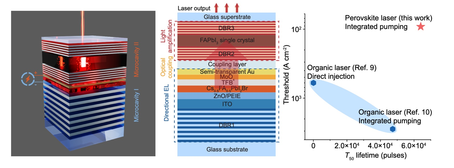 Dispozitivul cuplează eficient un număr mare de fotoni generați de un LED perovskit cu microcavitate excitat electric într-o a doua microcavitate. Acolo, ei sunt excitați de un mediu de câștig perovskit monocristal, generând laser cu o eficiență de cuplare de până la 82,7%. Curentul de pornire necesar pentru a declanșa acest nou laser semiconductor este de 92 de amperi pe centimetru pătrat, un ordin de mărime mai mare decât cel al celor mai bune lasere organice conduse electric și prezintă o stabilitate excelentă.