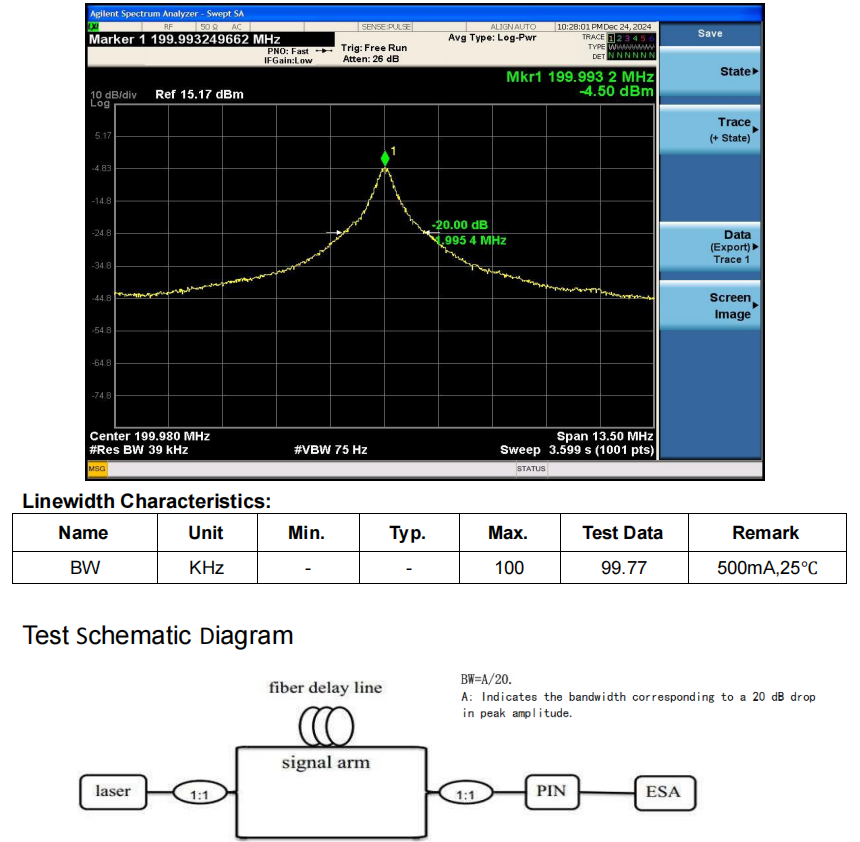 Box Optronicsa lansat o diodă laser DFB cu lățime de linie îngustă de 1550 nm, 100 mW, 100 kHz într-un pachet fluture cu 14 pini cu control integrat al temperaturii TEC și monitorizare PD. Acestprodusutilizează o structură de feedback distribuită, cu o lățime completă la FWHM de mai puțin de 100 kHz și un SMSR mai mare de 40 dB. Lungimea de undă de 1550 nm se încadrează în „fereastra cu pierderi reduse” a industriei comunicațiilor. Lățimea de linie îngustă sub 100 kHz și SMSR mai mare de 40 dB reduc efectiv zgomotul de fază și interferența modului în transmisia coerentă, făcându-l o sursă de lumină centrală pentru comunicații cu fibră optică de mare viteză și distanță lungă.