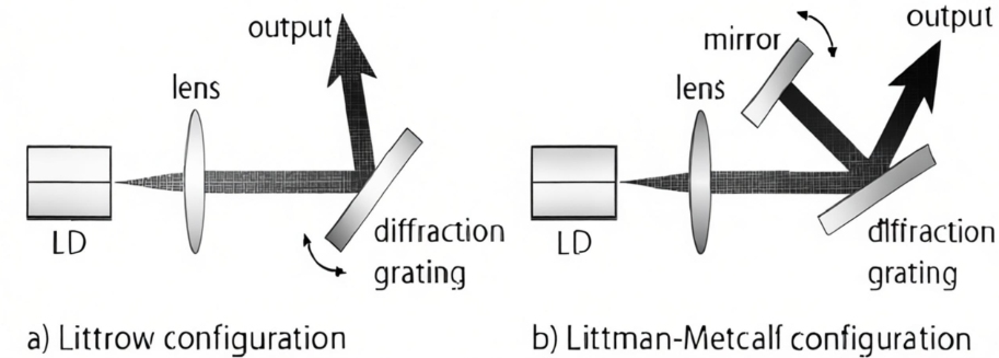 Laserele cu cavitate principală cu cavitate scurtă, cum ar fi DFB și DBR, au timp limitat de interacțiune a fotonilor intra-cavități, ceea ce face dificilă compresia lățimii de linie profundă. Pentru a comprima și mai mult lățimea liniei și a suprima zgomotul, astfel de configurații de cavitate principală cu cavitate scurtă sunt adesea combinate cu structuri cu cavitate externă pentru optimizarea performanței. Structurile comune ale cavității externe includ cavitățile externe spațiale, cavitățile externe ale fibrelor și cavitățile externe ale ghidului de undă. Înainte de dezvoltarea dispozitivelor cu fibră optică și a structurilor ghidurilor de undă, cavitățile externe erau compuse predominant din optică spațială combinată cu componente optice discrete. Printre acestea, structurile spațiale de feedback din cavitatea externă bazate pe rețele adoptă în principal modelele Littrow și Littman, constând de obicei dintr-o cavitate de câștig laser, lentile de cuplare și un rețea de difracție. Rețeaua, ca element de feedback, permite reglarea lungimii de undă, selectarea modului și compresia lățimii de linie.
